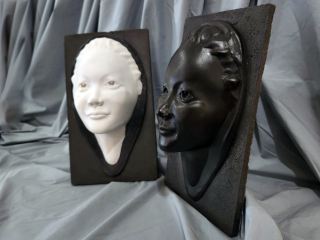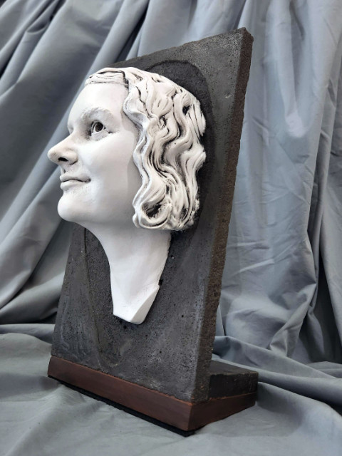 An individual plaster cast portrait on a polished concrete backing, available for stand-alone desktop display or wall mounting. 300mm x 160mm (with backing)